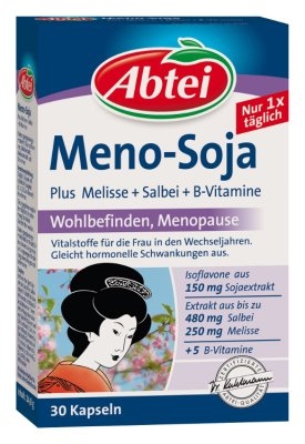 Stärkt das Wohlbefinden in den Wechseljahren Die hormonelle Umstellung der Frau in den Wechseljahren kann verschiedene belastende Begleiterscheinungen, wie Hitzewallungen, Schweißausbrüche oder Nervosität mit sich bringen. Eine gesunde Lebensführung, ausreichend Bewegung und eine abwechslungsreiche Ernährung spielen in dieser natürlichen Phase der Neuorientierung eine wichtige Rolle, um das innere Gleichgewicht zu erhalten, In Asien treten Wechseljahreserscheinungen, wie. z.B. Hitzewallungen, seltener auf. Das wird auch der unterschiedlichen Ernährungsweise zugeschrieben. Abtei Meno-Soja unterstützt den weiblichen Organismus in und nach den Wechseljahren: Vitamin B6 trägt zur Regulierung der Hormontätigkeit und zur Verringerung von Müdigkeit und Erschöpfung bei. Pantothensäure trägt zu einer normalen Synthese von Steroidhormonen, zu denen die weiblichen Geschlechtshormone gehören, bei. Die Vitamine B1, B2 und B12 werden für die Funktion des Nervensystems benötigt.