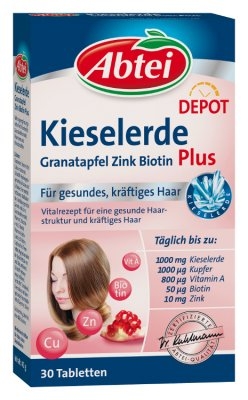 Kieselerde Granatapfel Zink Biotin Plus Tabletten Gesunde, gepflegte Haare sind in unserer Gesellschaft ein Schönheitsideal und genießen besondere Aufmerksamkeit. Hier kennt man wertvolle Inhaltsstoffe, die sich speziell für das Haar bewährt haben. Abtei Kieselerde Plus Granatapfel, jetzt als Depot-Formulierung, versorgt die Haarwurzel mit Mineralstoffen und unterstützt den Wachstumsprozess der Haare. So wird zum Erhalt der gesunden Haarstruktur beigetragen. Biotin trägt zu einer normalen Haarstruktur bei. Zink ist an der Bildung von Keratin, dem Hauptbestandteil von Haaren, beteiligt. Kupfer trägt zu einer natürlichen Haarpigmentierung bei. Vitamin A unterstützt die Gesunderhaltung der Haut, so auch der Kopfhaut. Das Besondere an Abtei Kieselerde Plus Granatapfel ist der Depot Effekt, der die Nährstoffe aus seinem Depot über mehrere Stunden hinweg an den Körper abgibt. Somit wird eine kontinuierliche Versorgung mit den enthaltenen Nährstoffen sichergestellt.