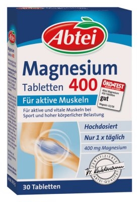 Abtei Magnesium 400 Tabletten Für aktive und vitale Muskeln Bei Sport und hoher körperlicher Belastung, aber auch unausgewogener Ernährung sollte man auf eine ausreichende Zufuhr von Magnesium achten. Magnesium aktiviert eine Vielzahl lebenswichtiger Enzyme, die unter anderem den Energiestoffwechsel in den Muskelzellen unterstützen. Eine ausgewogene Versorgung mit Magnesium ist daher wichtig für die Aufrechterhaltung und Vitalisierung der Muskelfunktionen. Abtei Magnesium 400 konzentriert einen hohen Magnesium-Gehalt in einer Tablette Verzehrsempfehlung : Verzehrsempfehlung für Jugendliche (ab 12 Jahren) und Erwachsene: Täglich 1 Tablette mit reichlich Flüssigkeit (z.B. 1/2 Glas Wasser) schlucken. Lactosefrei, glutenfrei. Nährstoffepro Tablette % der empf. Tagesdosis pro Tablette* Magnesium400 mg107 % * Referenzmenge nach EU-Lebensmittelinformationsverordnung Zutaten: Magnesiumoxid; Füllstoffe Cellulose, Hydroxypropylmethylcellulose und vernetzte Carboxymethylcellulose; Trennmittel Magnesiumsalze der Speisefettsäuren und Siliciumdioxid; Überzugsmittel Talkum; Farbstoff Titandioxid Das Abtei Gütesiegel steht für hochwertige Qualität der Produkte, die unter strengsten Anforderungen hergestellt werden.