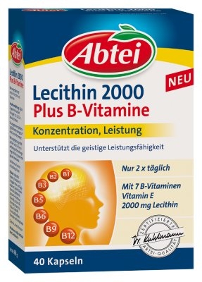 Abtei Lecithin 2000 Plus B-Vitamine Unterstützt die geistige Leistungsfähigkeit Starke Nerven, Konzentration und Leistungsfähigkeit werden benötigt, um den Belastungen im Alltag, im Beruf oder in der Familie gewachsen zu sein. Der Körper kann jedoch immer wieder an die Grenzen seiner Leistungsfähigkeit gelangen nachlassende Konzentration, Ermüdungserscheinungen und Unausgeglichenheit können die Folgen sein. In solchen Situationen kann es sinnvoll sein, den Körper mit nervenaktiven B-Vitaminen zu unterstützen. Abtei Lecithin 2000 Plus B-Vitamine unterstützt mit B-Vitaminen Konzentration und Nerven und trägt somit zur geistigen Leistungsfähigkeit bei. Der Komplex aus 7 B-Vitaminen unterstützt mit: Pantothensäure die geistige Leistungsfähigkeit B1 und B6 die normale psychische Funktion und die Nerven Folsäure und Niacin die Verringerung von Müdigkeit und Erschöpfung B2 und B12 einen normalen Energiestoffwechsel Mit dem Plus an Vitamin E: Vitamin E benötigt der Körper zum Schutz der Zellen vor oxidativem Stress.